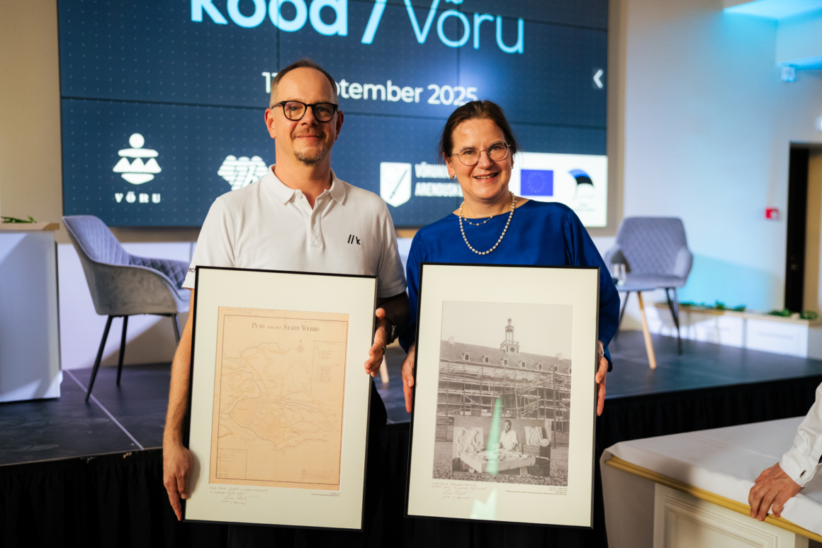 We were honored to receive two historic pictures from the National Archives of Estonia, presented to us by the minister. The first, dating back to 1837, shows the layout of Võr and its surroundings. The second, taken 100 years later in 1938, captures the newly built bank building during its facade work, along with the sculptor proudly presenting the two beautiful bas-reliefs that still adorn its exterior.