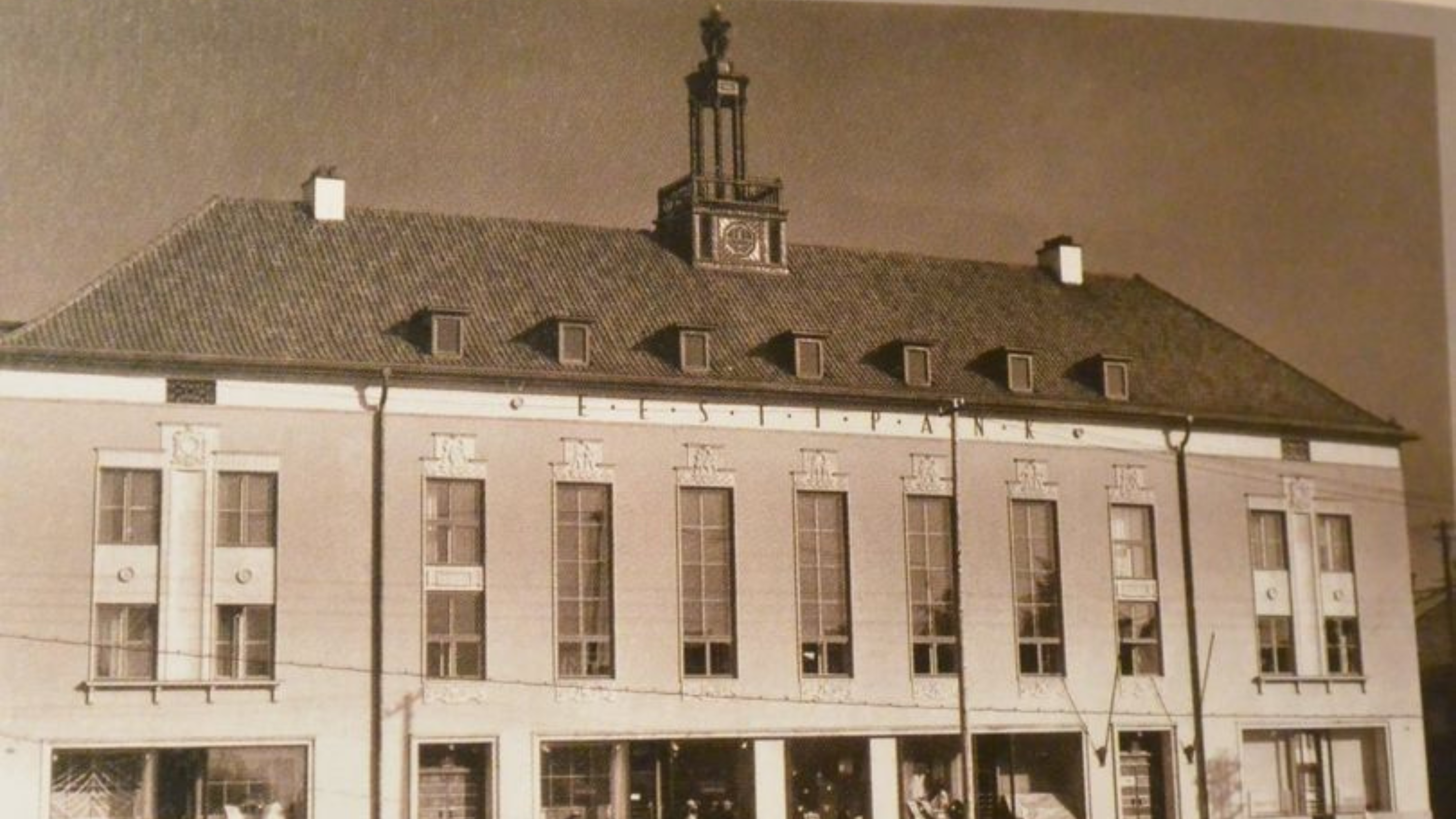 This representative bank building, designed in the traditionalist style, was completed in 1938 to frame the town square and marketplace of what was then a small provincial town. Now under heritage protection, the building features a characteristic steep roof and a symmetrical façade, adorned with stylised column motifs and national ornamental patterns.